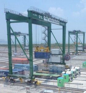 A specialized yard container crane. A RMG travels on rails to lift containers in the yard area. The containers are lifted by a spreader, which is attached to the RMG with cables. RMGs come in a variety of makes and models with different spans and dimensions.